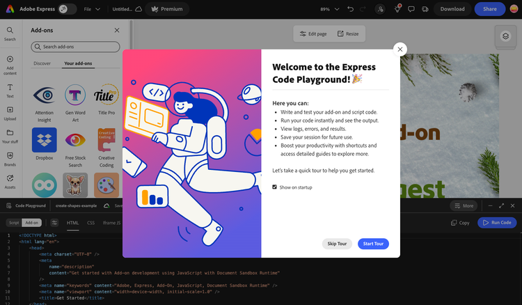 The Adobe Express Code Playground received a major upgrade, making it even better for experimenting, prototyping, and shipping add-on ideas. You can now jump to Code Playground via direct link (https://www.adobe.com/go/addon-playground) or use the “Try in Playground” buttons in the how-to guide samples.