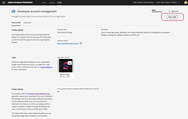 Publishers can now take full control of their public profiles. Creative Cloud, Adobe Express, and Experience Cloud developers no longer need to email support for profile updates. With the new self-service workflow, you can sign in to Developer Distribution — this applies to Adobe Express developers as well — update your public profile and EU-DSA trader details, and submit changes for review.