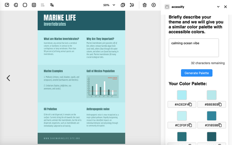 Accessify helps creators check whether their content adheres to the Web Content Accessibility Guidelines (WCAG) and suggests new colors that are more accessible. The newest feature is an AI color palette recommender. Users can type color-related adjectives or describe their design’s theme (e.g. “vibrant”, “retro”, or “calm ocean”) and watch the AI suggest the perfect color palette to suit their vision. The goal for Accessify was to eliminate the need for designers to switch between different tools to check accessibility and find appropriate colors, streamlining the design process with Adobe Express.